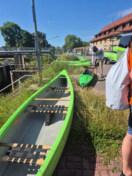 Wir haben beim Bootsverleih Halle 6 Boote geordert, die per Transporter zur Schleuse Rischmühleninsel transportiert wurden. Uns stand 09: 22 Uhr ein Bus am Club zur Verfügung, der uns nach Merseburg brachte. Nach kurzer Einweisung - die meisten sind "paddelerfahren" - konnten wir die Boote übernehmen, und los ging es auf der Saale Richtung Halle - siehe Bilder oben.